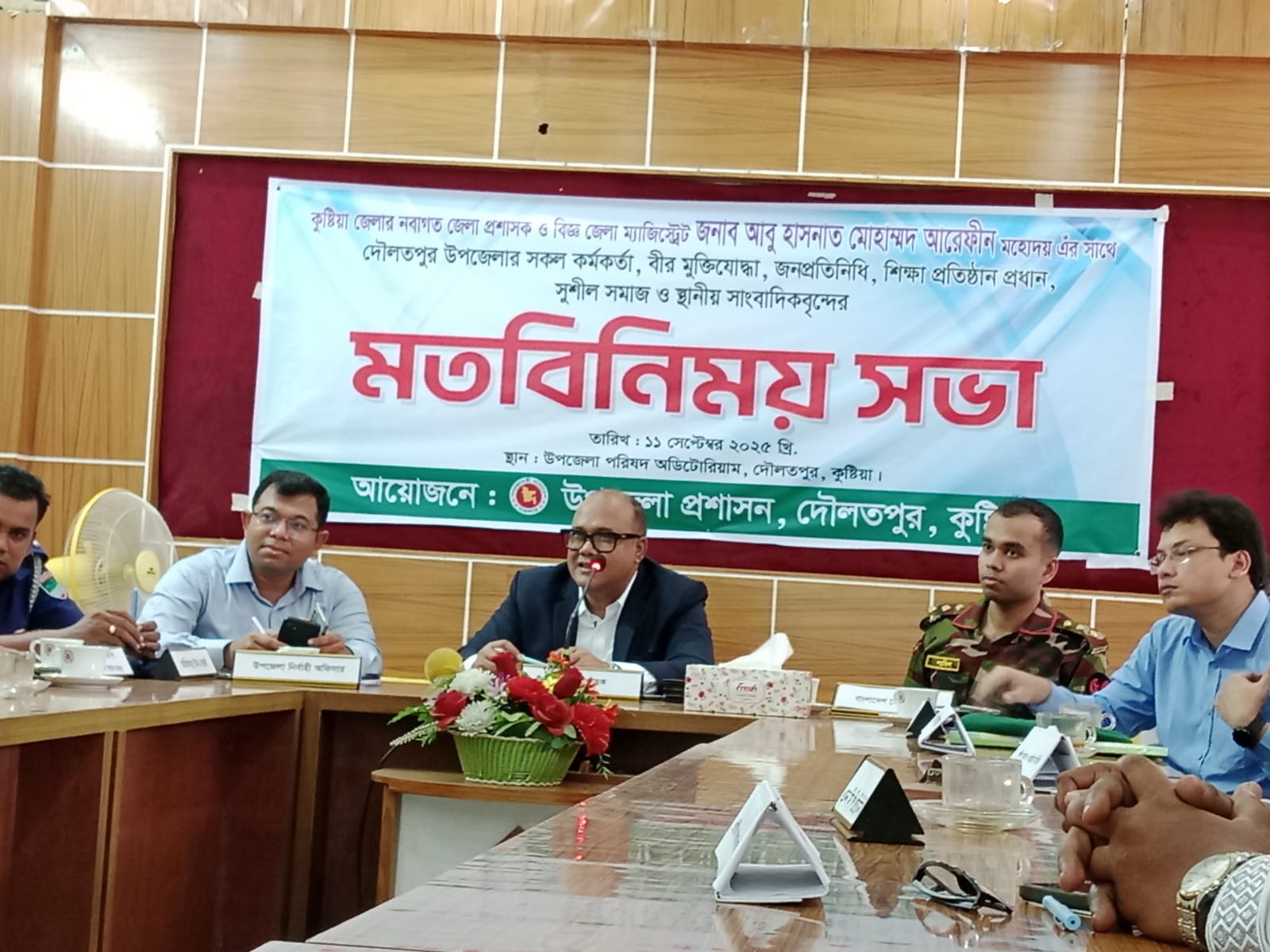 কুষ্টিয়া দৌলতপুরে জেলার নবাগত জেলা প্রশাসক ও জেলা ম্যাজিস্ট্রেট আবু হাসনাত মোহাম্মদ আরেফীন দৌলতপুর উপজেলার সকল কর্মকর্তা, বীর মুক্তিযোদ্ধা, জনপ্রতিনিধি, শিক্ষা প্রতিষ্ঠান প্রধান, সুশীল সমাজ ও স্থানীয় সাংবাদিকবৃন্দের মতবিনিময় সভা করেছেন। উপজেলা প্রশাসনের আয়োজনে বৃহস্পতিবার (১১ সেপ্টেম্বর) দুপুরে দৌলতপুর উপজেলা পরিষদ অডিটরিয়ামে এ মতবিনিময় সভা অনুষ্ঠিত হয়।