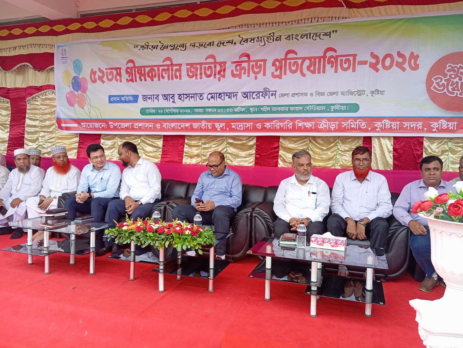 কুষ্টিয়া সদর উপজেলা কর্তৃক আয়োজিত জাতীয় স্কুল মাদ্রাসা ও কারিগরি শিক্ষা ক্রীড়া সমিতির। ৫২ তম জাতীয় গ্রীষ্মকালীন ক্রীড়া প্রতিযোগিতা ২০২৫ পালিত।